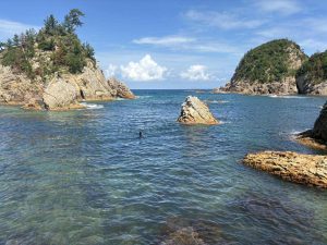 あ、今回海に詳しい方に立ち会っていただいて入りました。特に岩場は危なくて、基本、海水浴はゴールデンウィークからお盆。今は波も荒いしクラゲもいるの気をつけないといけないそうです。海のことを知らない観光客の方が亡くってしまうこともあるらしく、念の為お知らせです。すっごいきれいだから、入りたくなっちゃいますよね。っていうか、入っちゃいましたが。