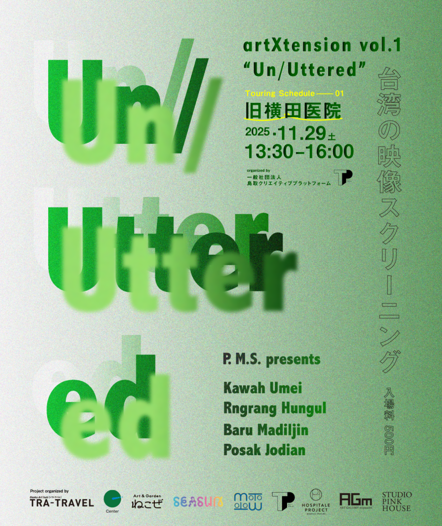 「企画の地産地消から巡回へ」をキーワードに、各アートスペースが企画したプロジェクトを、国内外に巡回させることで、より多くの観客や地域に届けることを目的とするネットワーク/プロジェクト artXtension(アート・エクステンション)の企画 第1弾として実施される本企画は、元々、2024年にTRA-TRAVEL(大阪)が、台湾のコレクティブOCAC内のチームP.M.Sと共に企画した、台湾の映像スクリーニング『Un/Uttered』をベースに、国内8箇所のアートスペースに巡回されるものです。